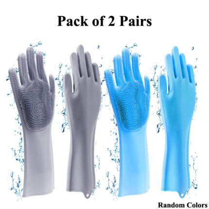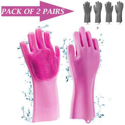 2 Pairs Kitchen Magic Silicone Dishwashing Gloves with Cleaning Scrub Sponges Dual Set for Efficient Scrubbing