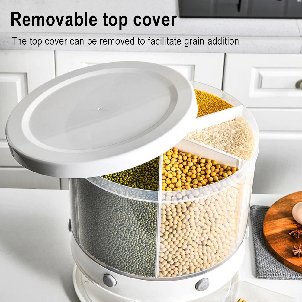 Equipped with 6 grid storage, can keep the food or grain separated, 360° rotatable design, you can choose whatever you want with just one turn.