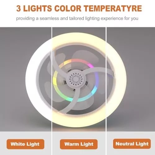 【16 RGB & 3 Lights Color Socket Fan】This small ceiling fan light includes 6-inch LED light source, the 360° Rotating ceiling fans light is even and soft, bright and not harsh, increasing the range of irradiation, which can effectively enhance the brightness of the whole space. You can easily adjust the color temperature from warm (3000K) to cool (6500K) using the remote control, providing a seamless and tailored lighting experience for you.