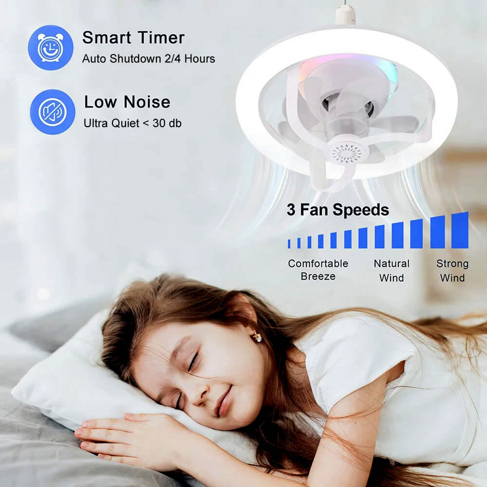 【Ceiling Fan with Light】This small socket fan meets both of your needs and saves you money! The ceiling fan with light combines an LED shade with socket fan light in an E27 install based, making installation as easy as changing a light bulb. Simply plug it into any electric light socket in your home. The screw in low profile ceiling fan is no tools or help from an electrician are required, making installation a breeze.