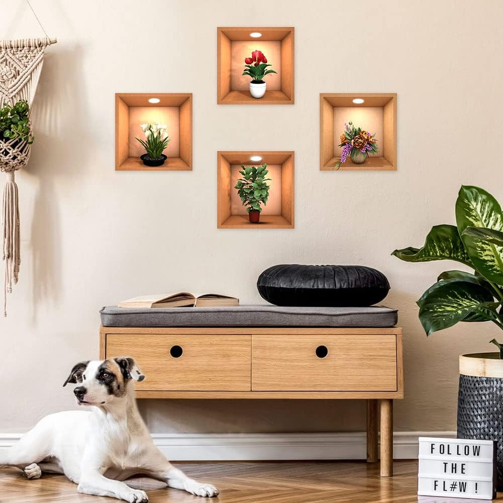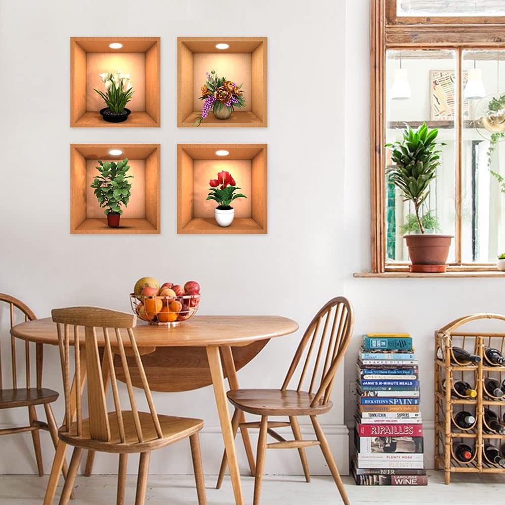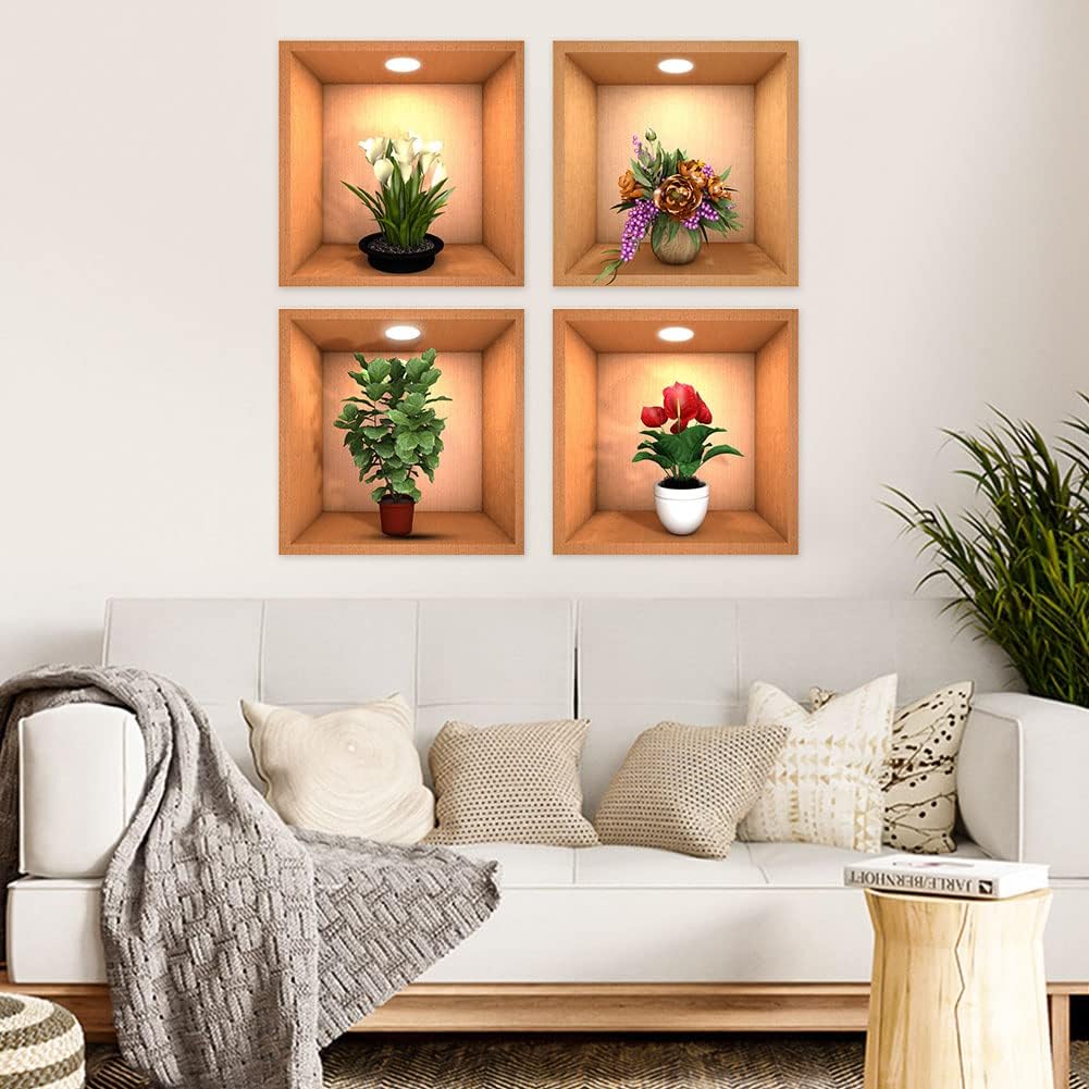 4 Sheets Flower Decoration Art Magic Sticker,3D Vinyl Removable Wall Sticker Decals DIY, Plants False Niche Green Potted Plants Mural (Style-B)