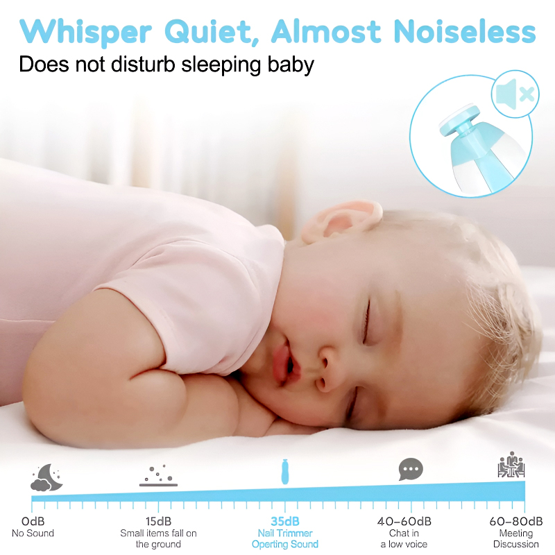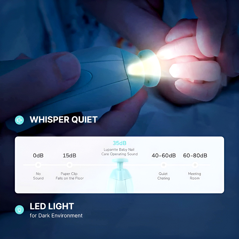 The 6-in-1 Safe & Efficient Electric Baby Nail File and Trimmer is designed to offer a safer and more efficient way to trim and polish nails without damaging cuticles or soft nail beds. Perfect for babies, children, and adults, this multi-functional nail trimmer allows you to quickly and safely care for little toenails and fingernails. With its whisper-quiet motor operating at only 60 decibels and a built-in LED front light, you can easily trim your baby’s nails even while sleeping, ensuring a peaceful and undisturbed experience.