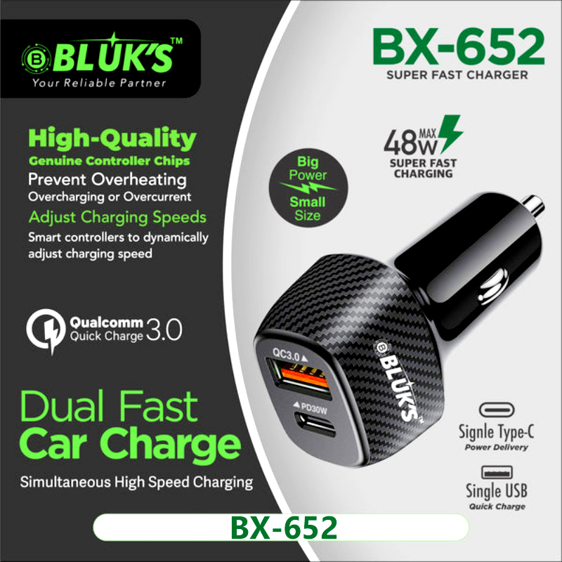 Charge smarter, faster, and safer with the BLUK’S BX-652 Dual Fast Car Charger. Engineered with export-quality standards, this compact powerhouse delivers 48W of total output, ensuring your devices never run out of battery while on the road. Equipped with PD Type-C (30W) and QC 3.0 USB-A (18W) ports, it supports simultaneous high-speed charging for modern smartphones, tablets, GPS units, and more.