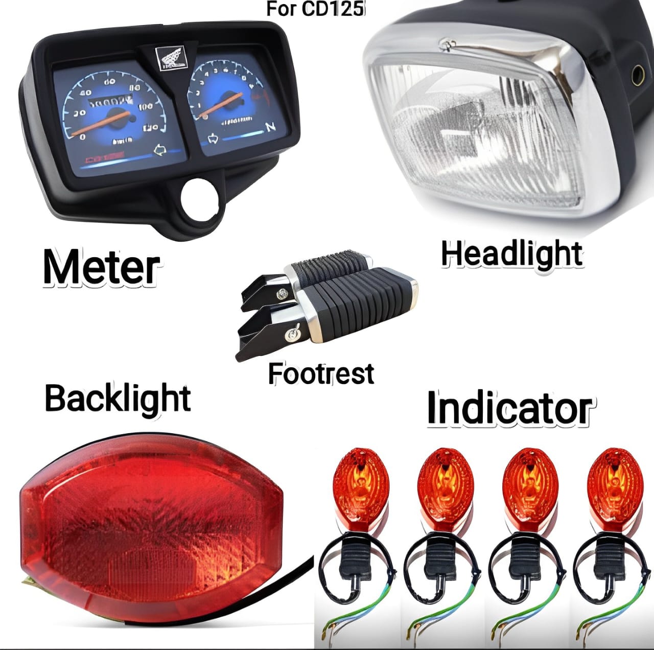 Complete set of essential bike parts for CD125 motorcycles.• Includes meter, headlight, backlight, indicators, and footrest.• High-quality materials for durability and reliable performance.• Compatible with all motorcycle CD125 models.• Perfect for replacement or upgrade of lighting and footrest components.