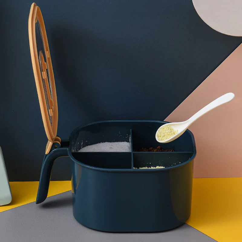 CONVENIENT USE: The inside of the square seasoning box is divided into four parts to combine different seasonings into a whole. It can store salt, sugar, cumin, pepper and so on, and it is equipped with four small white spoons.