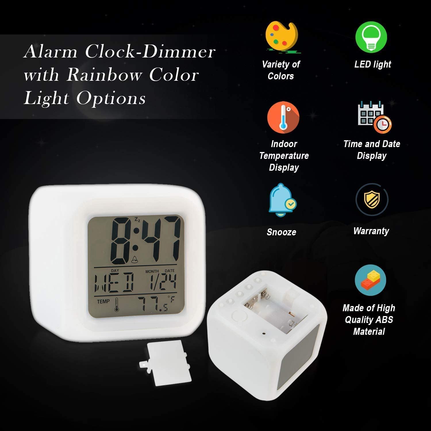 - Our digital clock glows in 7 different colors, so you can choose what works best with you in the morning .