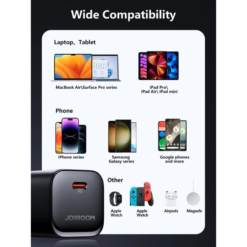 The Joyroom JR-TCF07EU is a high-performance 30W USB-C fast charger engineered for speed, efficiency, and safety. Equipped with Power Delivery (PD) 3.0, Quick Charge (QC) 3.0, PPS, Samsung AFC, and Huawei FCP compatibility, it ensures ultra-fast and reliable charging for a variety of devices, including smartphones, tablets, and even MacBook Air.