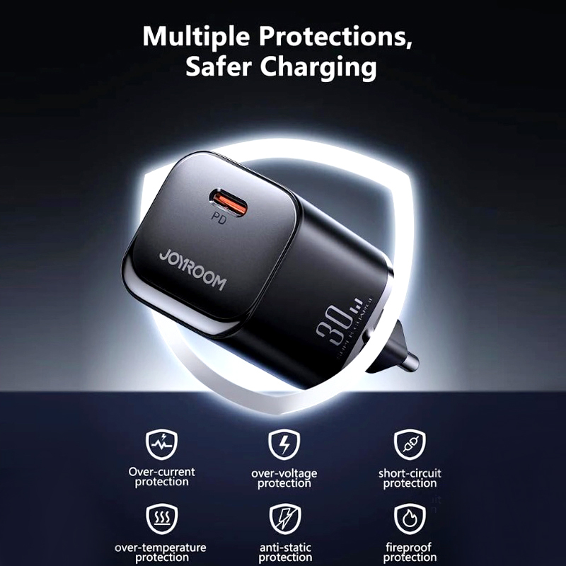 The single USB-C port delivers optimized power output with a maximum of 30W, allowing you to charge your devices efficiently wherever you are. Whether at home, in the office, or on the go, the Joyroom JR-TCF07EU is the ultimate fast-charging solution, combining universal compatibility, robust safety features, and a sleek, travel-friendly design.