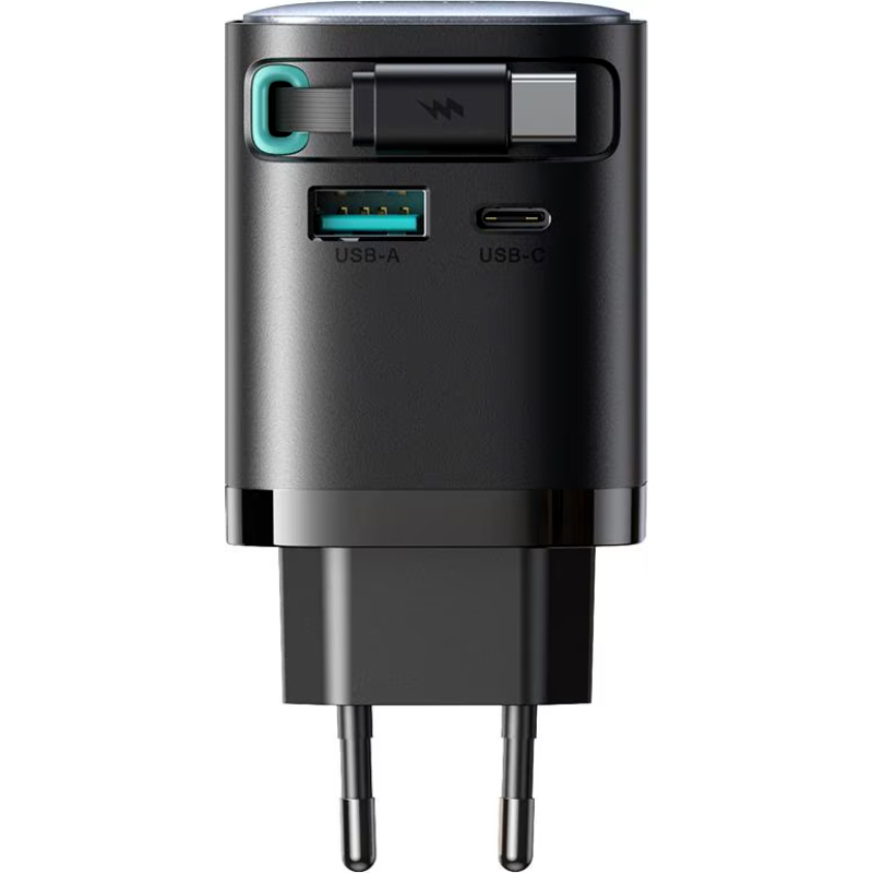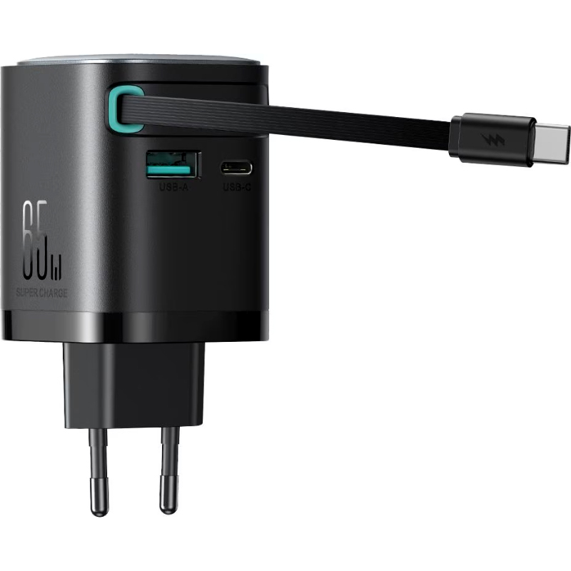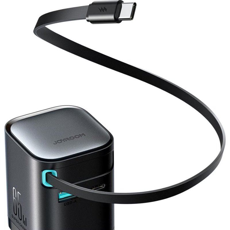 Joyroom JR-TCL02EU 65W GaN Charger with Retractable USB-C Cable, Dual-Port USB-A & USB-C, PD 3.0 Fast Charging, Compatible with Laptops & Smartphones