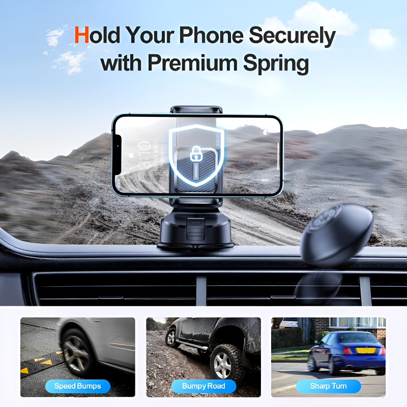 This phone holder features a premium spring-loaded clamp that securely holds your phone in place, along with a convenient one-button release mechanism for quick detachment. With 360° rotation and full adjustability, you can effortlessly switch between portrait and landscape modes, ensuring the perfect viewing angle for navigation or hands-free calls. Its compact and sleek design minimizes obstructions, offering a better driving view and enhanced safety.