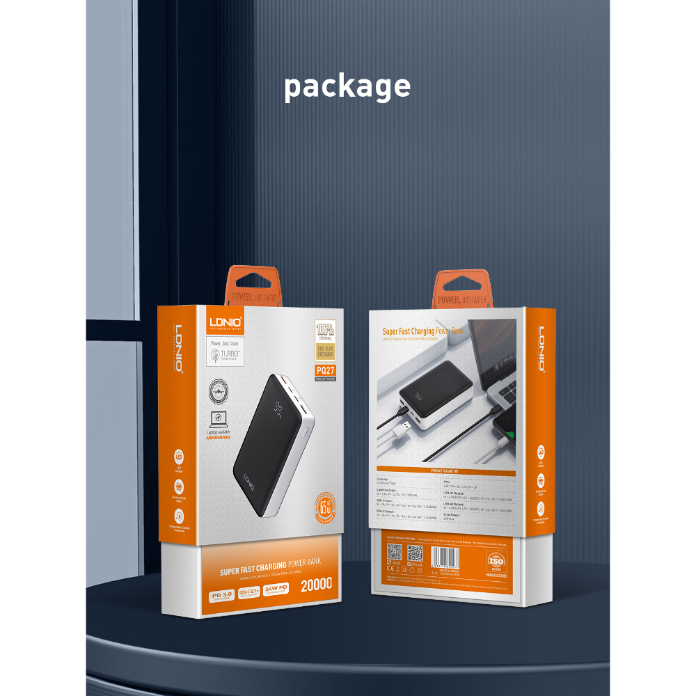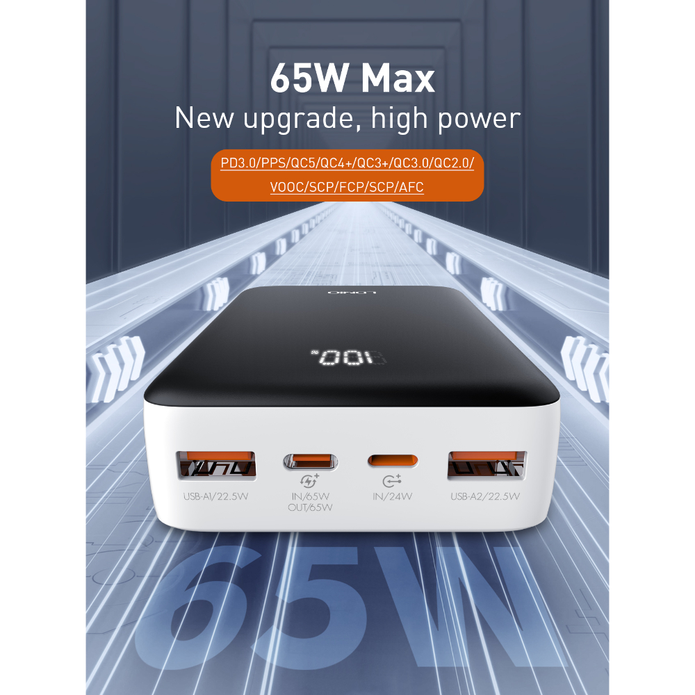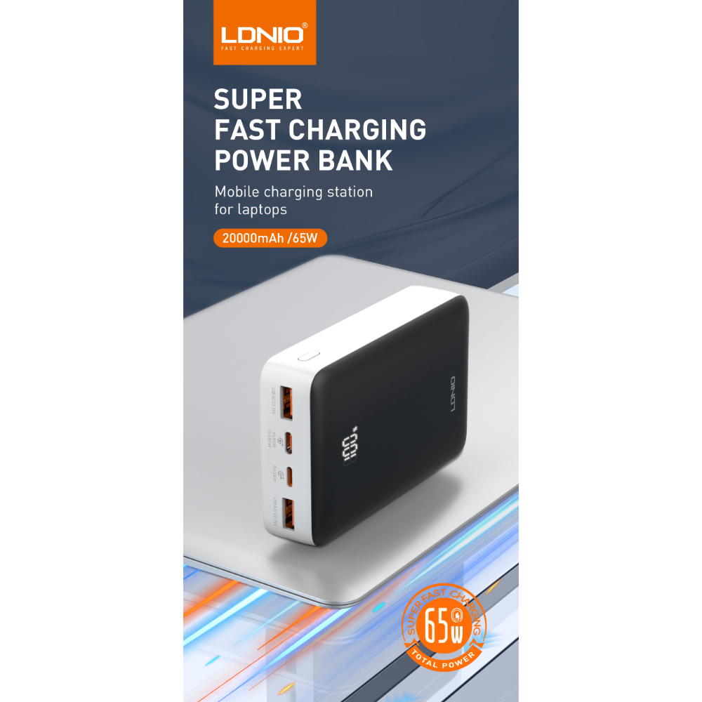 The LDNIO PQ27 65W Power Bank is a high-performance portable charger designed for fast and efficient power delivery.