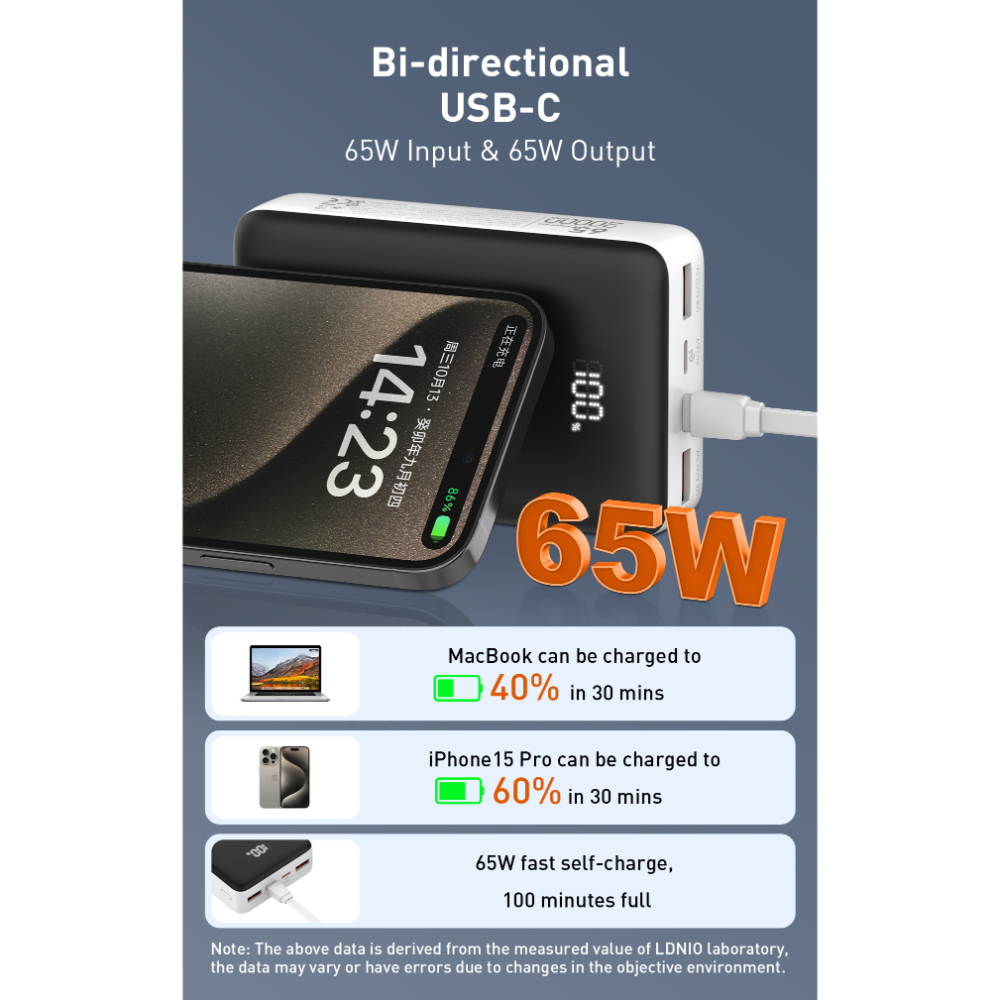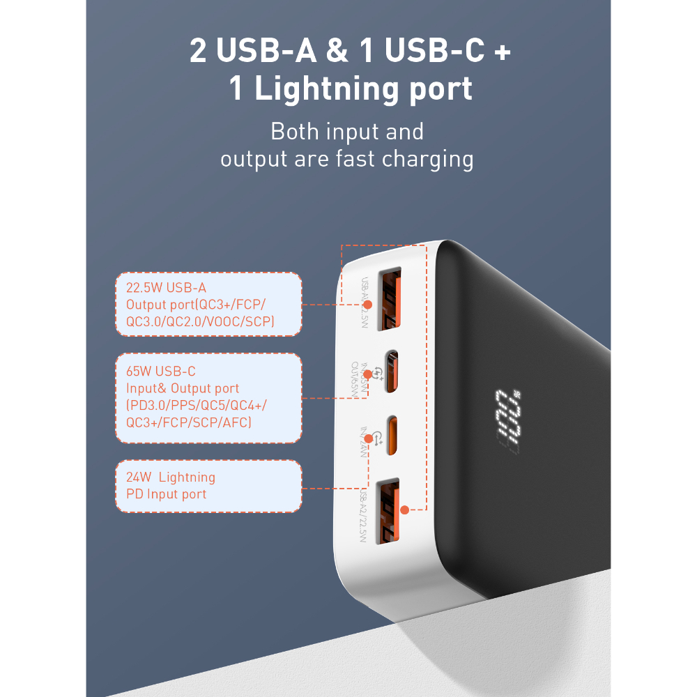 Multiple Ports for Versatile Charging: USB-C Input/Output: Supports up to 65W for fast charging and recharging the power bank itself15.