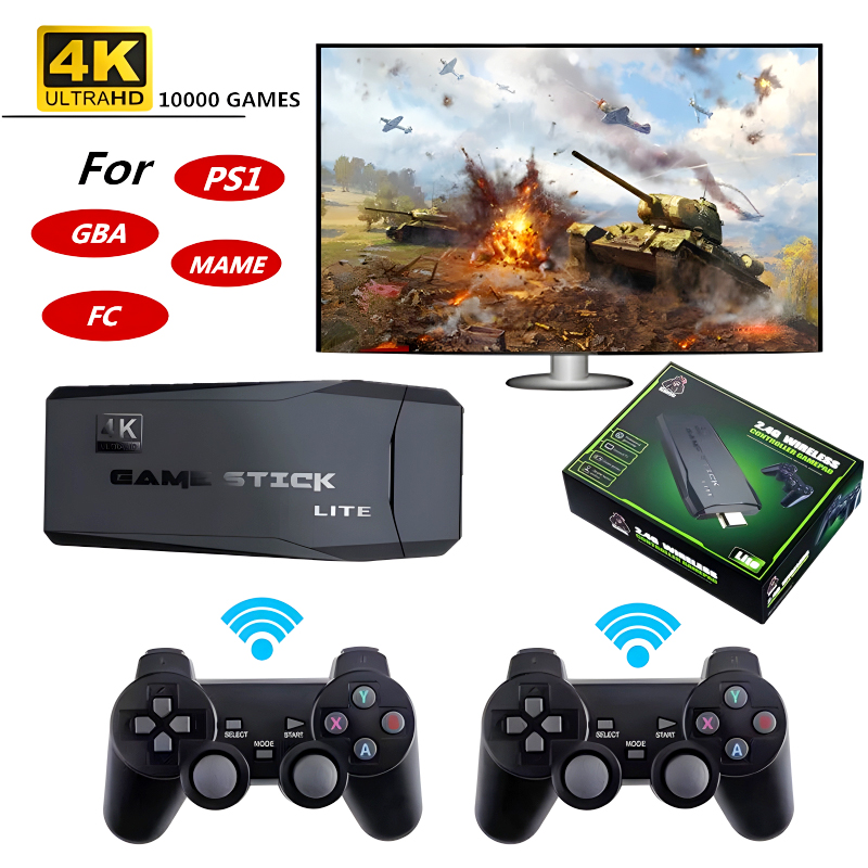 Immerse yourself in the gaming experience with the included 2.4G wireless controllers, allowing you to enjoy games from the comfort of your couch. The console supports stunning 4K resolution, delivering crisp and vibrant visuals to your TV screen.