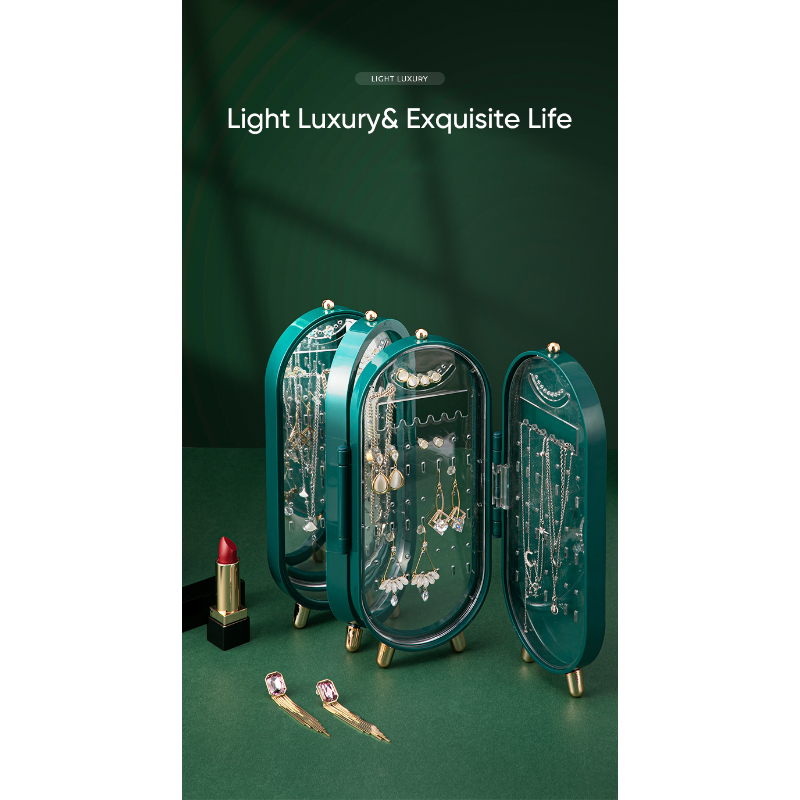 What sets this jewelry organizer box apart is its innovative foldable screen design, ingeniously crafted to maximize space efficiency. This design not only optimizes storage but also prevents entanglement and friction between ornaments during both display and storage. When not showcasing your jewelry, simply fold the jewelry box, and it seamlessly transforms into a compact storage solution.