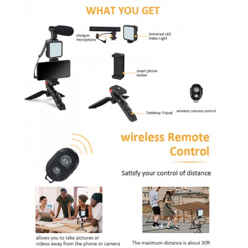 What’s in the box: 1 x Handheld Tripod Stand, 1 x Phone Holder, 1 x Wireless Remote Control, 1 x Fill Light, 1 x Microphone, 1 x Audio Cable