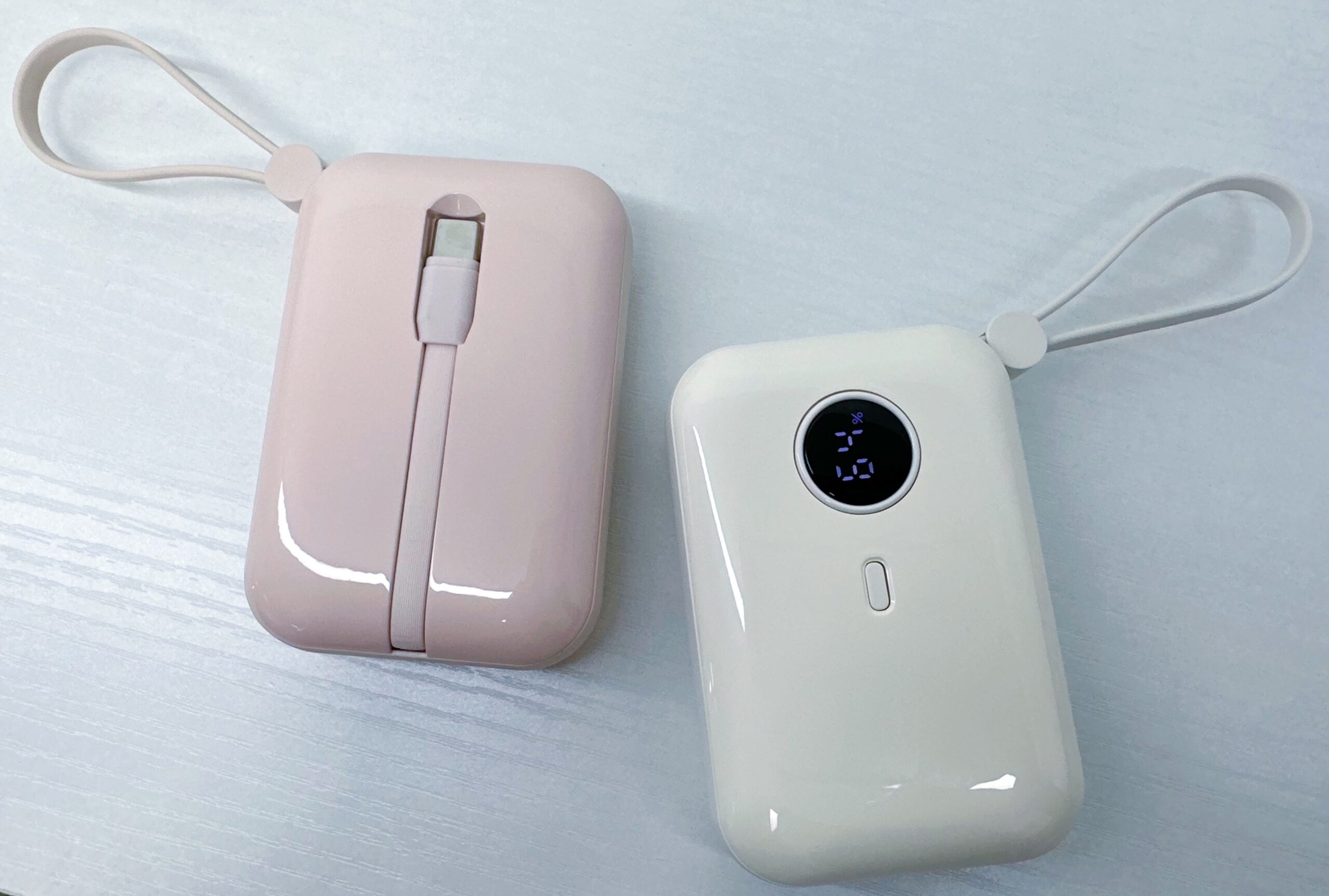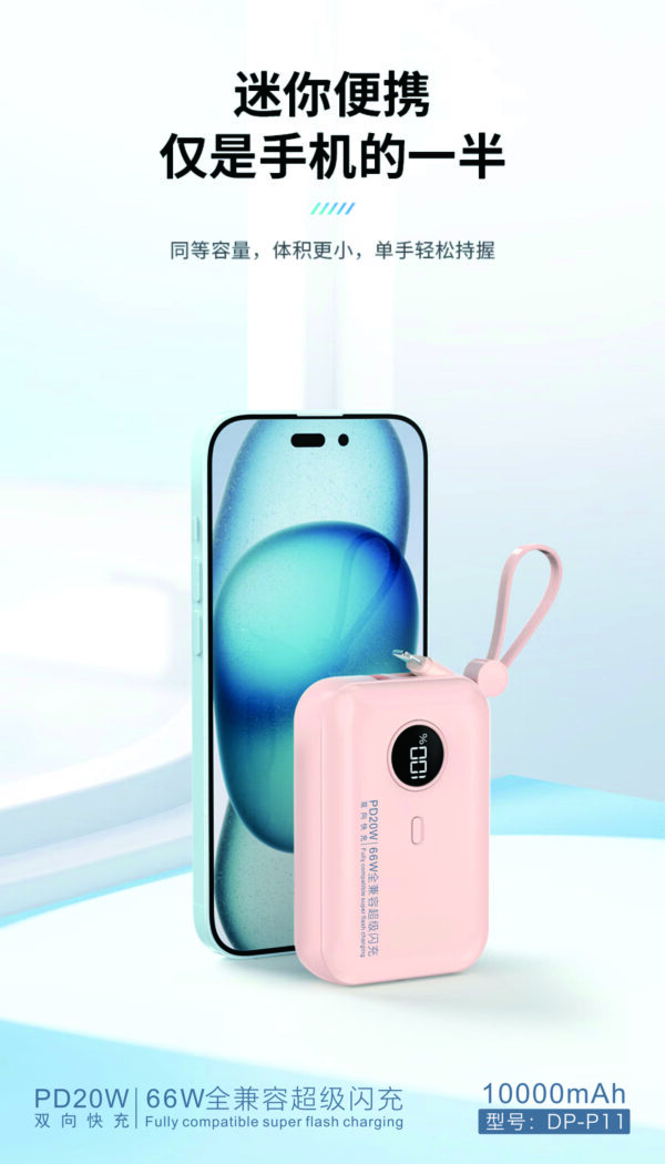 Power bank with type-C charging cable. It has digital display, we can know the power directly. It’s in mini size and with handle, very easy to take out.