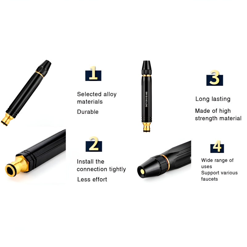 Upgrade your cleaning and gardening tasks with the High-Pressure Adjustable Water Spray Nozzle. This nozzle is made from durable metal and delivers high hydraulic power, ensuring efficient water pressure for thorough cleaning and watering. Its quick connection feature makes it compatible with automobile water pipes, making any job convenient.