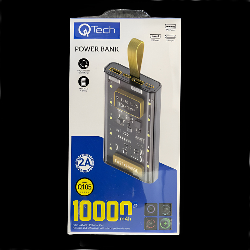 Introducing the QTech Q105 10000mAh Transparent Power Bank, designed to keep your mobile devices charged on the go.
