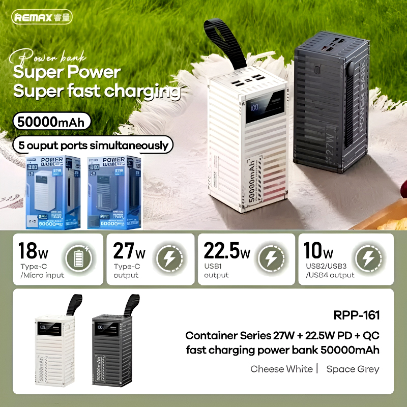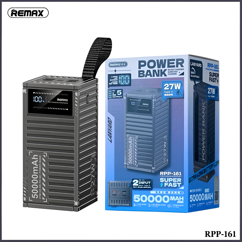 The Remax RPP-161 is a high-capacity 50000mAh powerbank designed for extended use for outdoor adventures, travel, or daily charging. Equipped with PD 27W and QC 22.5W fast-charging technology, it delivers rapid and efficient power to multiple devices.