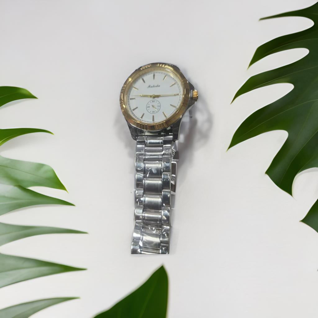 Elevate your style with this sleek and sophisticated men’s watch from Saleda. Featuring a classic white dial with gold accents and a stainless steel band, this timepiece exudes timeless elegance. The quartz movement ensures precise timekeeping, Perfect for any occasion, this watch is a must-have for the modern gentleman.