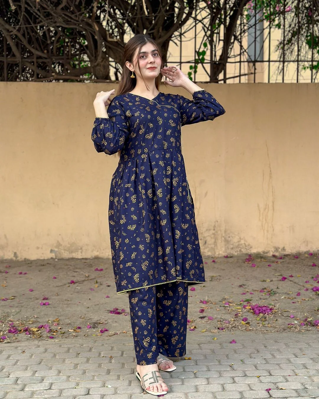2pcs flower printed Stitched Suit Stone Winter linen Suit WINTER COLLECTION