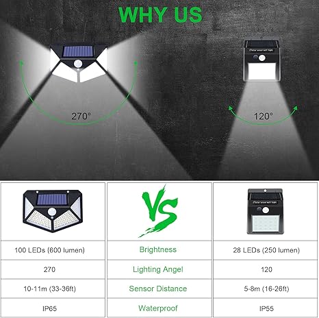 【Strong Brightness & Large Coverage】There are 100 Led lights inside of the solar light which will bring the stronger brightness in the dark for you. And, this solar wall light will cover up to 320ft², the motion distance is between 9-16 ft, the angle of the sensor is 120°.